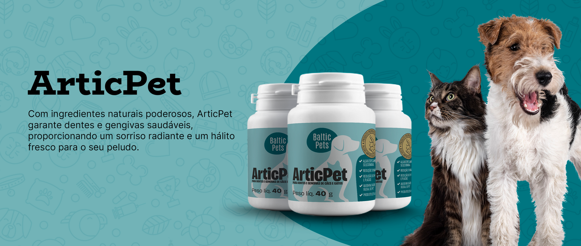 Conheça o ArticPet, o mais novo produto da linha Super Premium Baltic Pets. Desenvolvido com tecnologia europeia avançada, especialmente formulado para melhorar a saúde bucal de cães e gatos. Com uma combinação poderosa de ingredientes naturais, o ArticPet é a solução ideal para garantir dentes e gengivas saudáveis, proporcionando um sorriso radiante e um hálito fresco para o seu pet.